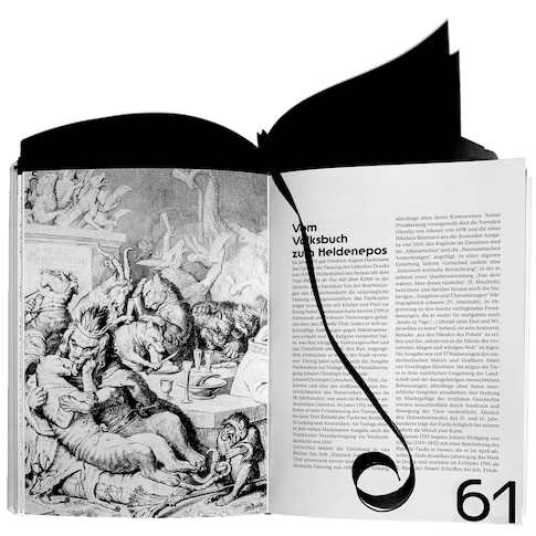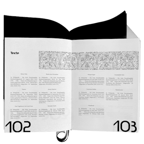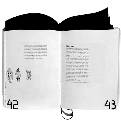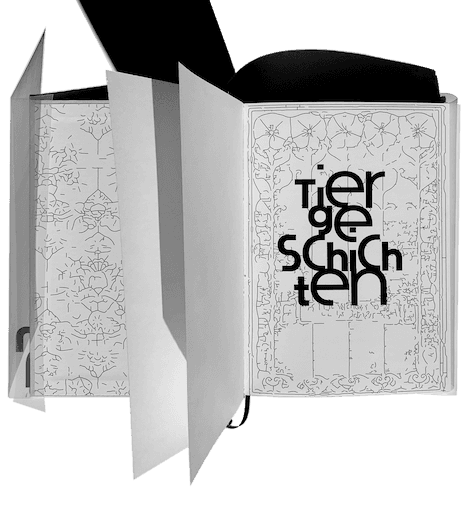 Ich wollte ein Buch machen, das ich wirklich lesen wollen würde. Nicht nur mal so durchblättern. Früher wurde mir viel aus reich verzierten Märchenbüchern vorgelesen. Ich verbinde mit altertümlich geschmückten Seiten wunderliche Gesichte, die sich zwischen den Seiten verstecken. „Tiergeschichten“ ist eine Neuinterpretation solcher traditioneller Buchgestaltung.